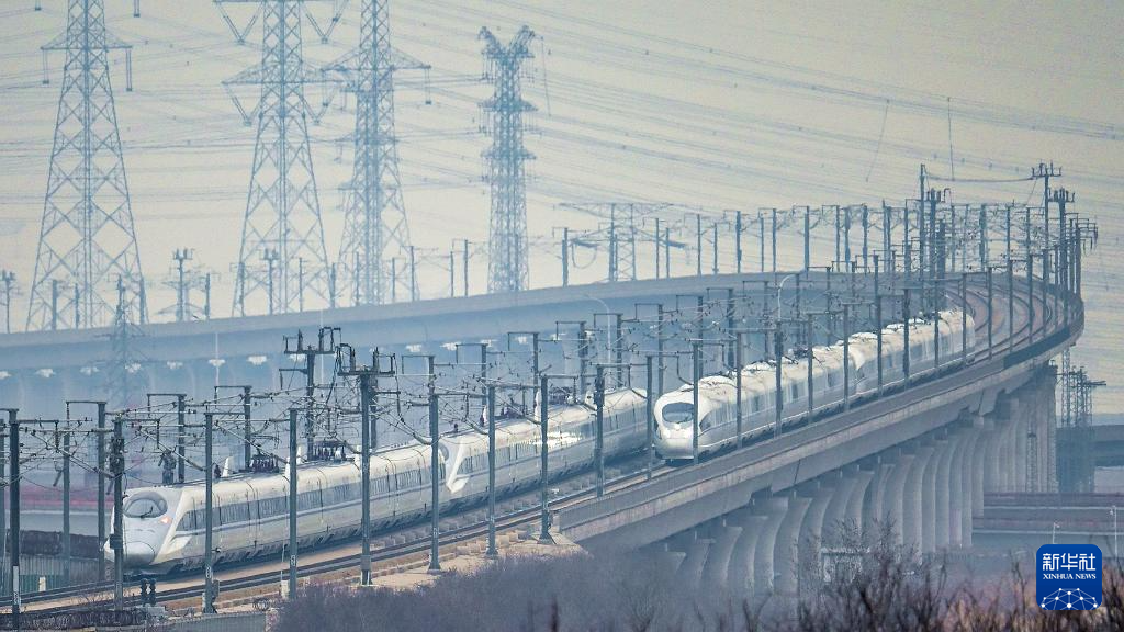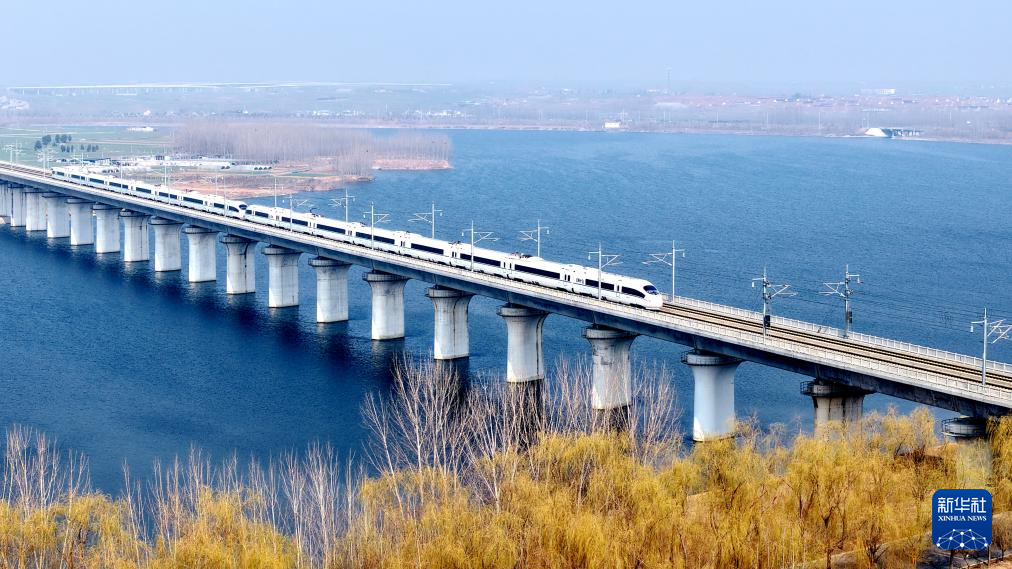 3月13日,动车组列车行驶在天津市境内(无人机照片)。