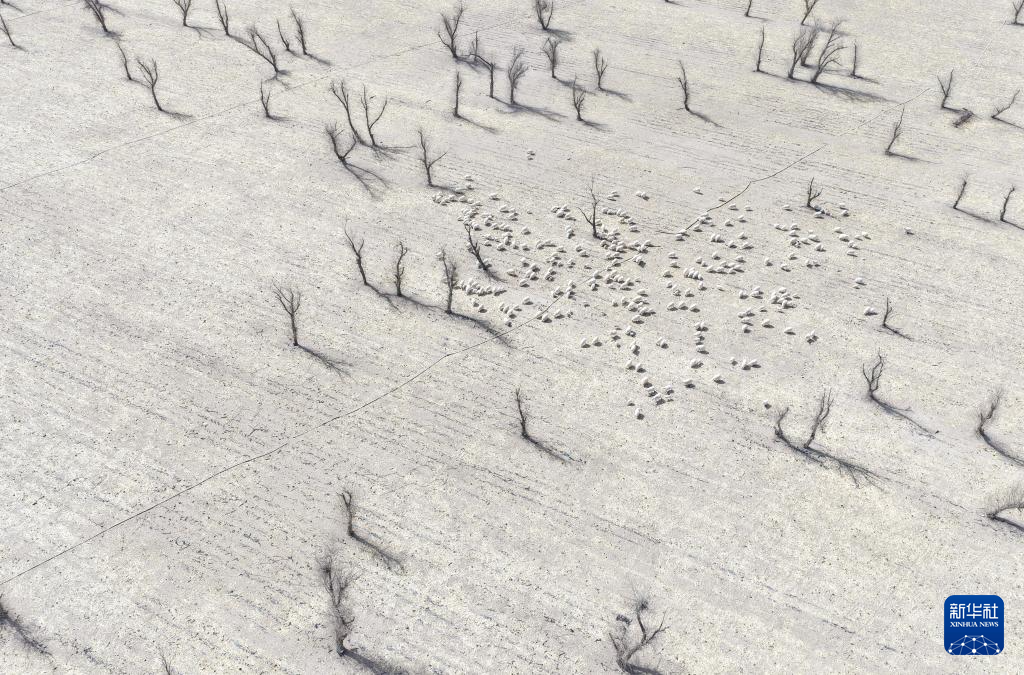 在甘肃省张掖市甘州区碱滩镇二坝村的借牧点,羊群在玉米秸秆地中觅食(3月7日摄,无人机照片)。每年十月中下旬,气候逐渐变冷,青海省海北藏族自治州祁连县部分牧户会将牛羊迁往甘肃省张掖市等地,借助当地玉米、向日葵等秸秆地开始为期5至6个月的借地放牧,来年三月,借牧点陆续开始准备农业生产,借牧户将牛羊运回本地草场。