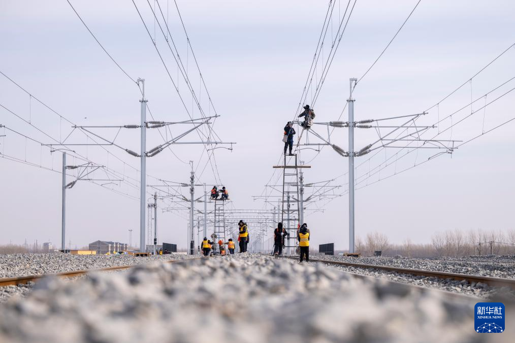 在哈伊高铁绥化南站施工现场,来自中铁武汉电气化局的工人克服低温天气,全力推进哈伊高铁“四电”工程建设(3月13日摄)。哈伊高铁是我国“八纵八横”高铁网京哈-京港澳通道的延长线,起自黑龙江省哈尔滨市,途经绥化市,终至伊春市。