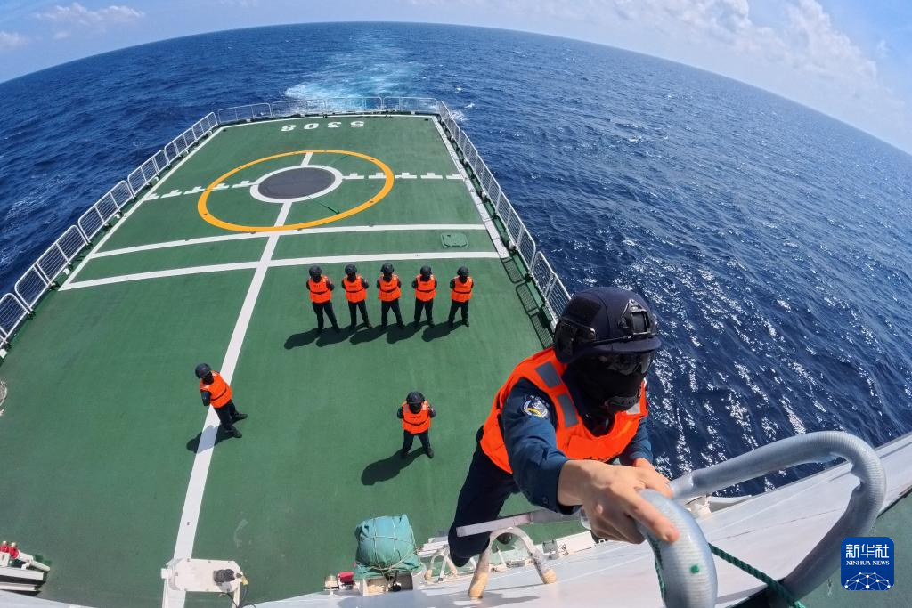 海警三都舰组织执法员进行登临制控训练(3月8日摄)。近日,海警三都舰编队在我国南海某海域执行巡航值守任务,维护祖国海洋权益。中国海警执法员开展常态巡逻执法、组织日常训练、管理服务过往船舶等工作。