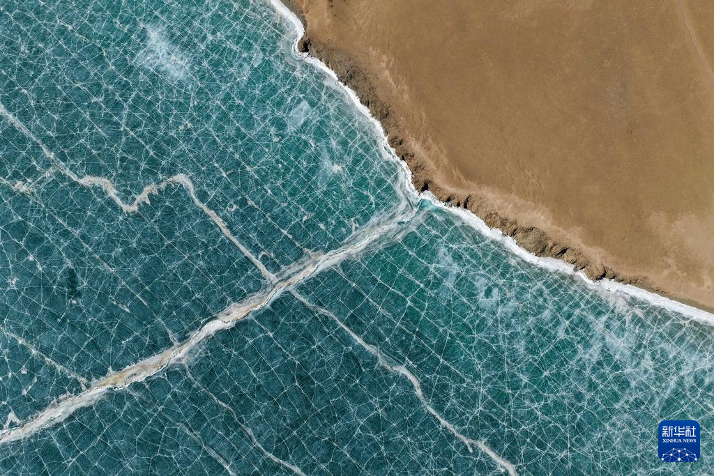 冰雪渐融的青海省果洛藏族自治州玛多县境内扎陵湖一角(3月10日摄,无人机照片)。