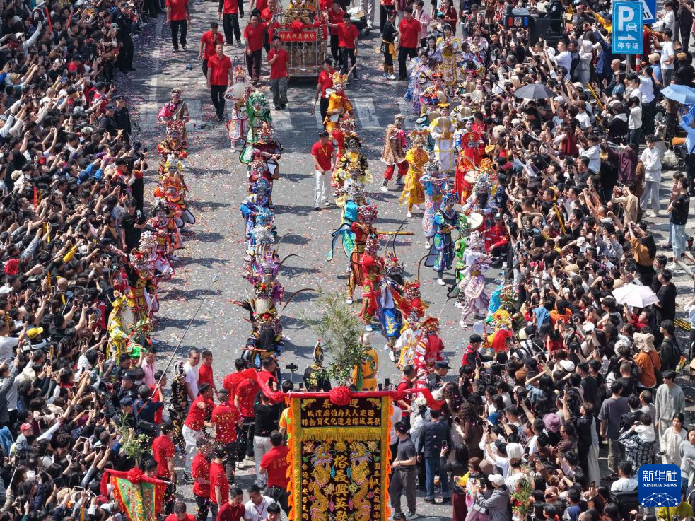 广东揭阳城隍庙会巡游队伍中的英歌舞表演(3月11日摄,无人机照片)。