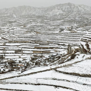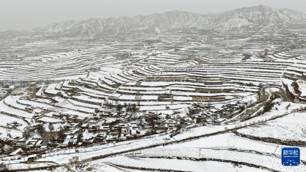3月13日在甘肃省临夏回族自治州永靖县陈井镇拍摄的雪后梯田和村庄(无人机照片)。