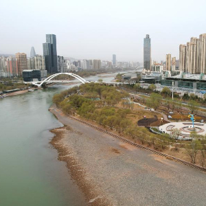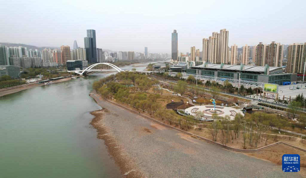 这是位于兰州市城关区黄河岸边的马拉松公园(无人机照片,3月18日摄)。