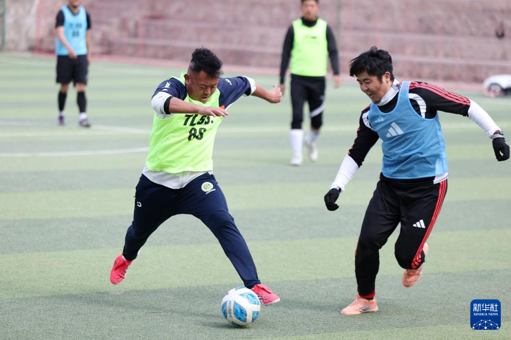 3月17日,足球爱好者在兰州市体育公园的足球场踢球。