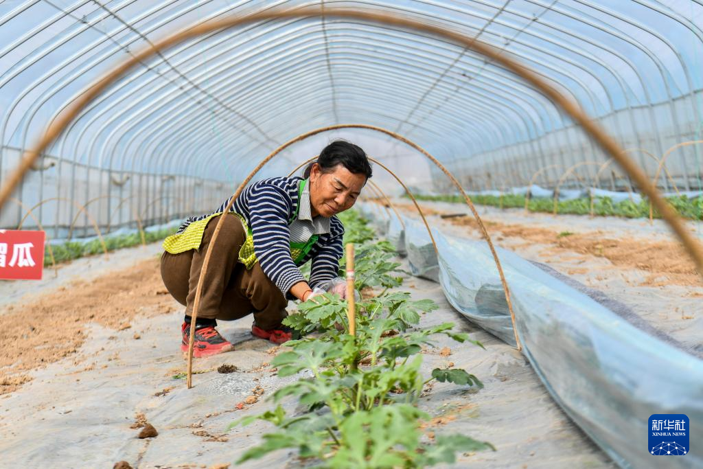 3月18日,山西省运城市夏县夏乐精品瓜业合作社的工作人员在管护西瓜苗。