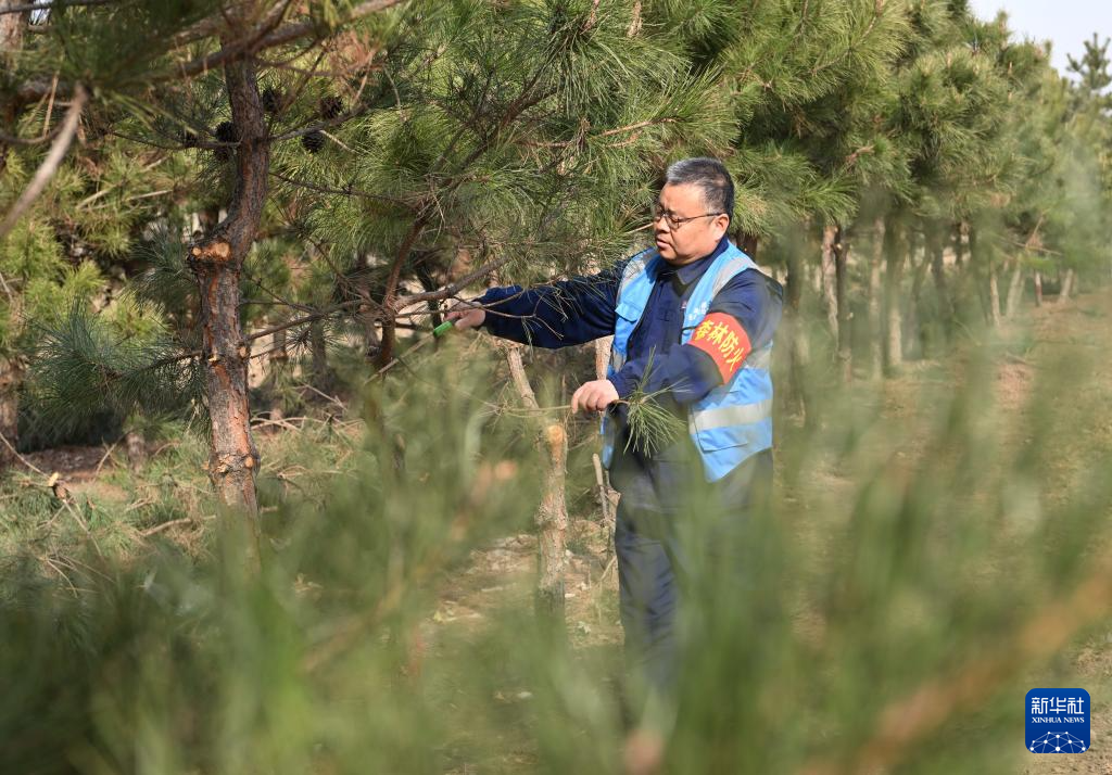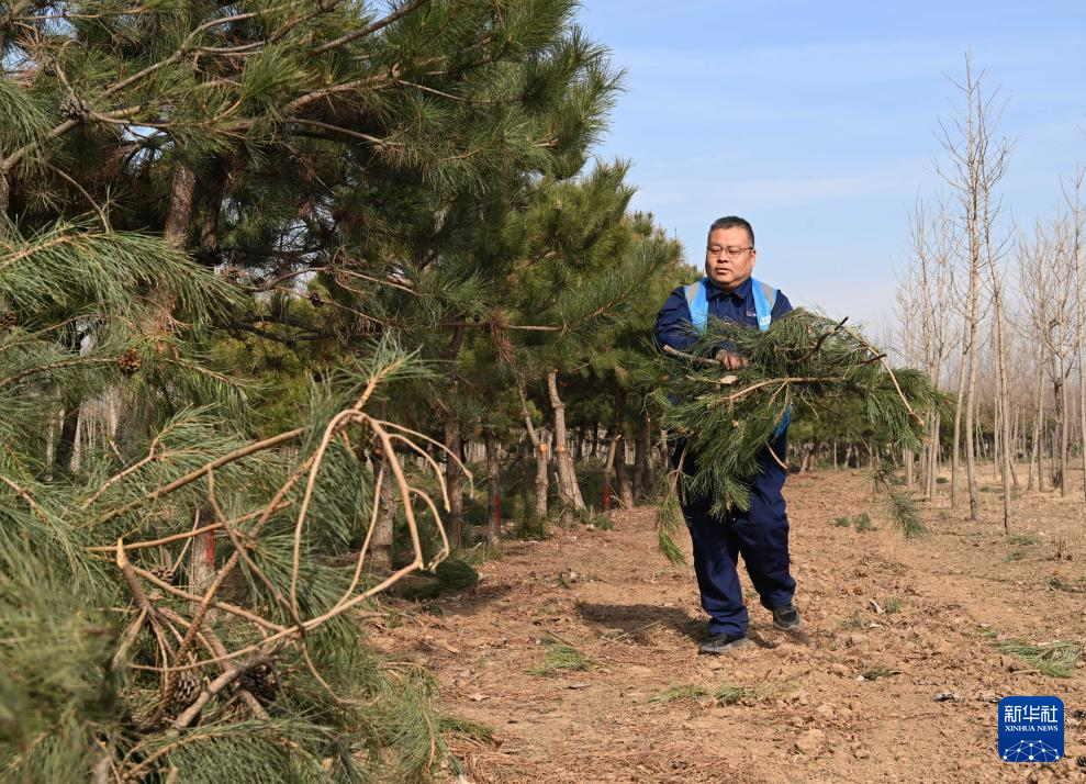 3月19日,刘世光在雄安新区“千年秀林”雄中片区的树林里修剪树枝。