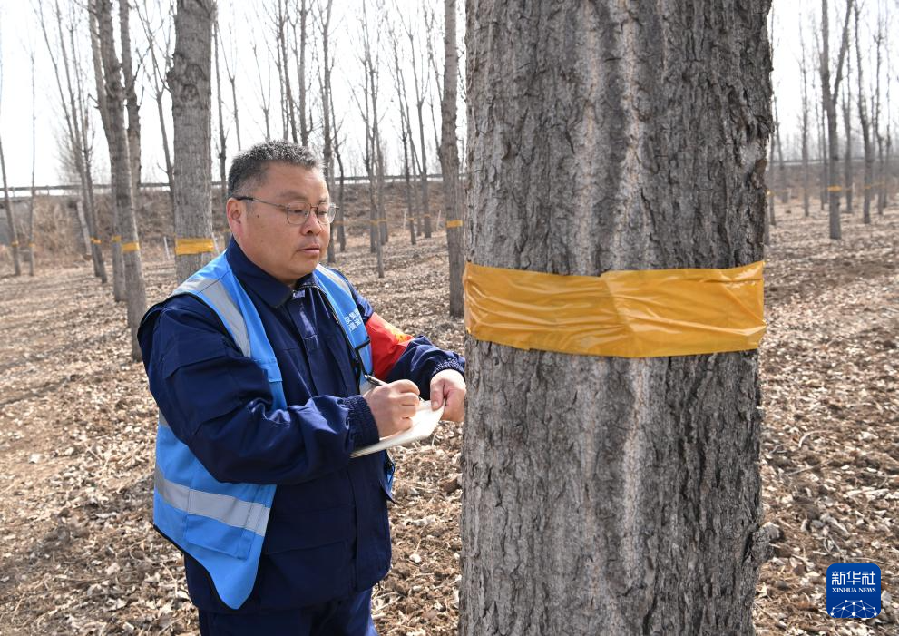 3月19日,刘世光在雄安新区“千年秀林”雄中片区的树林里测量树木生长量。