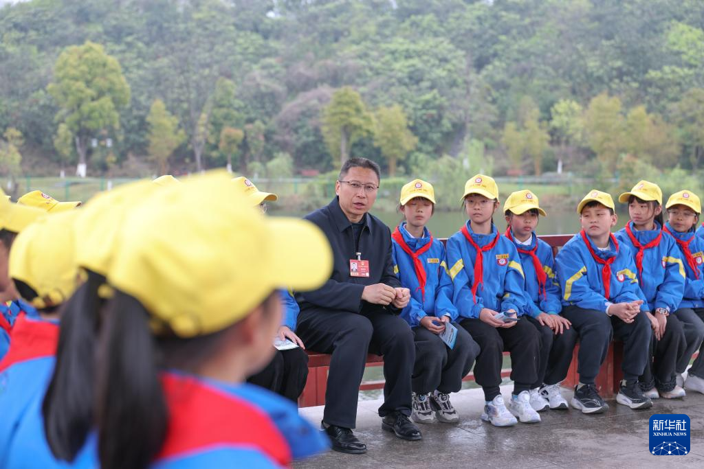 3月20日,在重庆永川区神女湖边,全国人大代表傅国涛向参加“世界水日”“中国水周”科普实践体验活动的红河小学“小黄帽”志愿服务队的同学分享生态环境法典与日常生活的关系。
