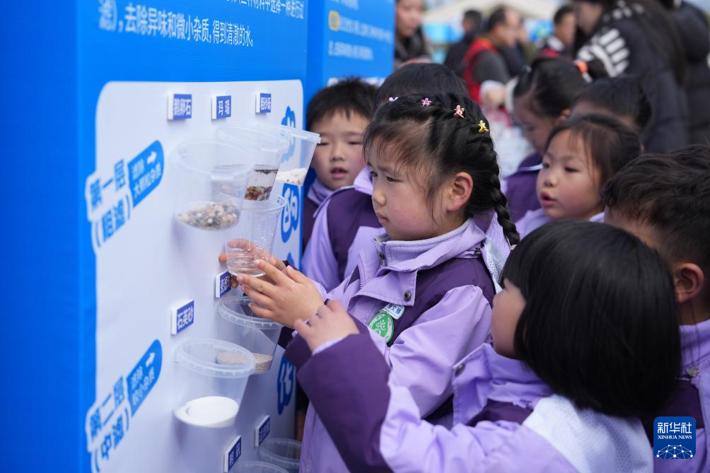 3月20日,小朋友在浙江宁波北仑区梅山湾沙滩公园举办的“水利科技集市”上体验净水过滤环节。