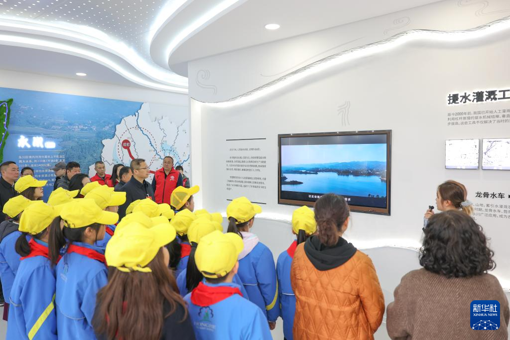 3月20日,在重庆市永川区临江河水文化展示馆,参加“世界水日”“中国水周”科普实践体验活动的红河小学“小黄帽”志愿服务队的同学和部分巡河代表在观看提水灌溉工程介绍。