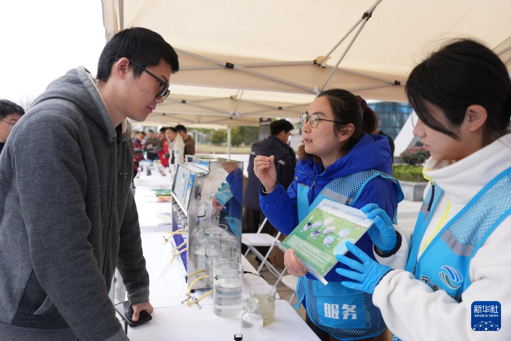 3月20日,工作人员在浙江宁波北仑区梅山湾沙滩公园举办的“水利科技集市”上向观众介绍净水技术。