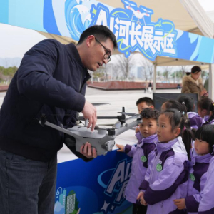 3月20日,在浙江宁波北仑区梅山湾沙滩公园的“水利科技集市”上,工作人员向小朋友介绍智慧水利设备。
