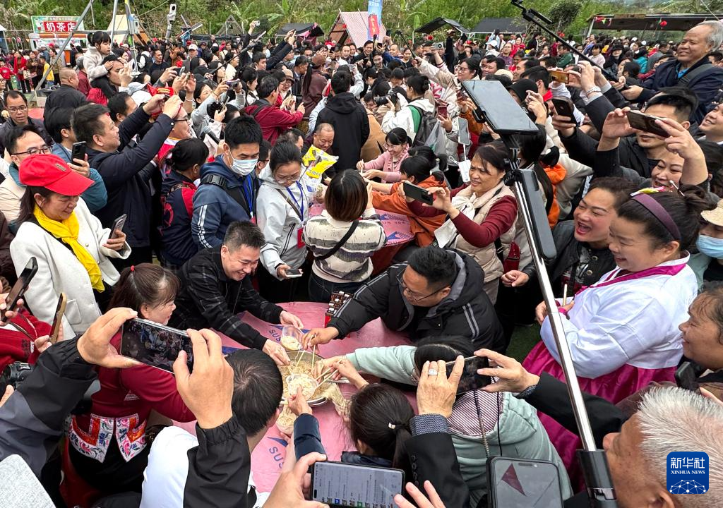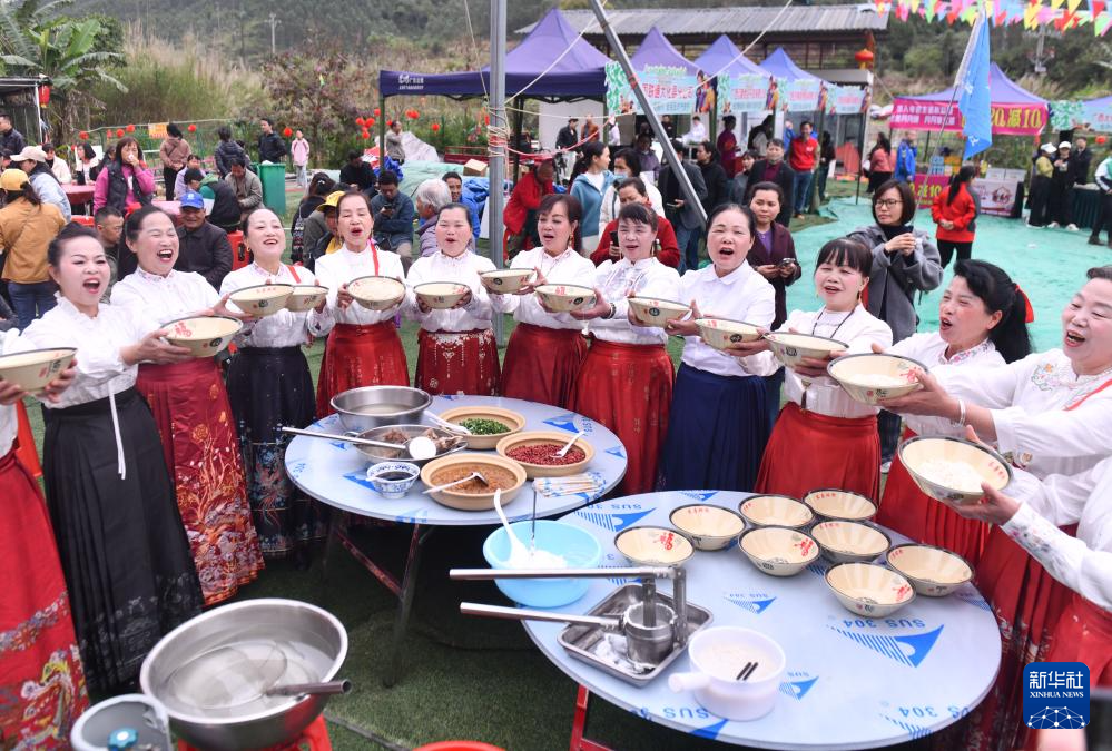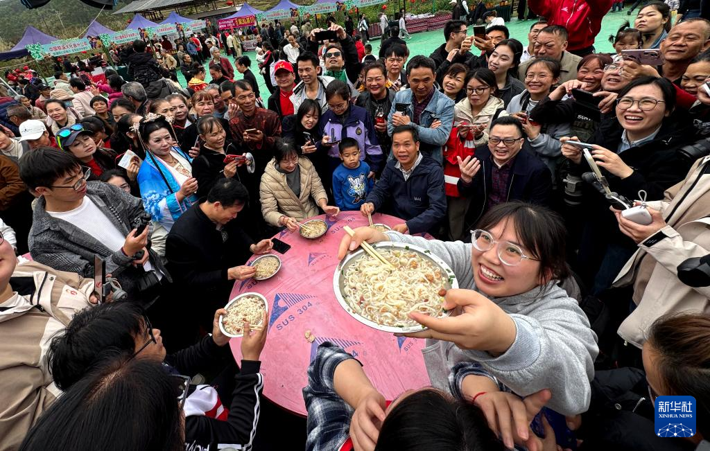 人们在广西河池市大化瑶族自治县“生榨米粉非遗技艺比拼”活动中品尝生榨米粉(3月21日摄)。