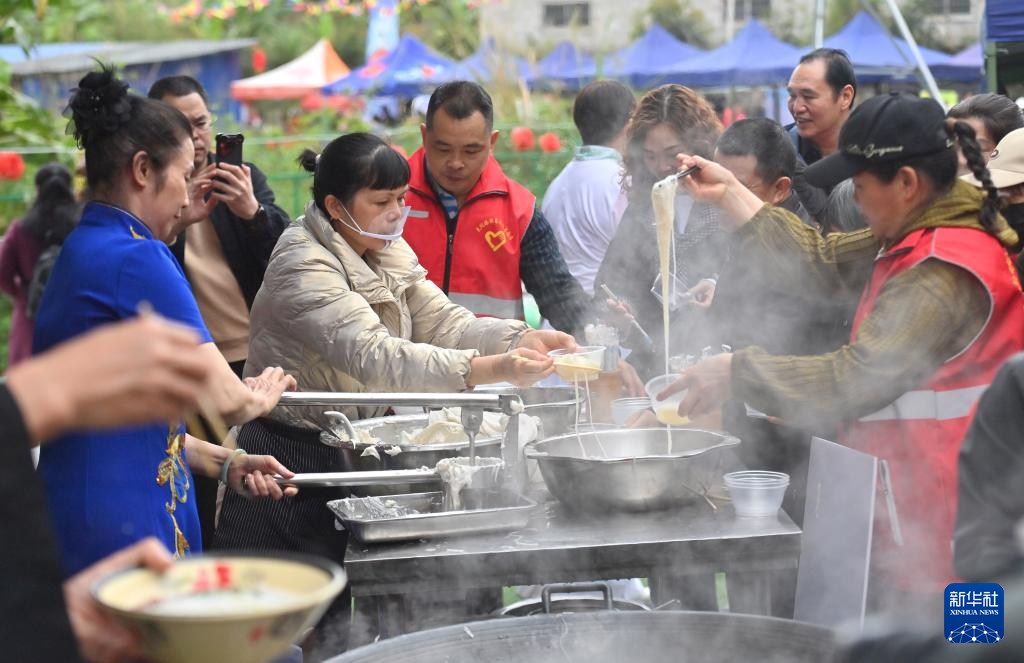工作人员在广西河池市大化瑶族自治县“生榨米粉非遗技艺比拼”活动中为市民和游客准备生榨米粉(3月21日摄)。