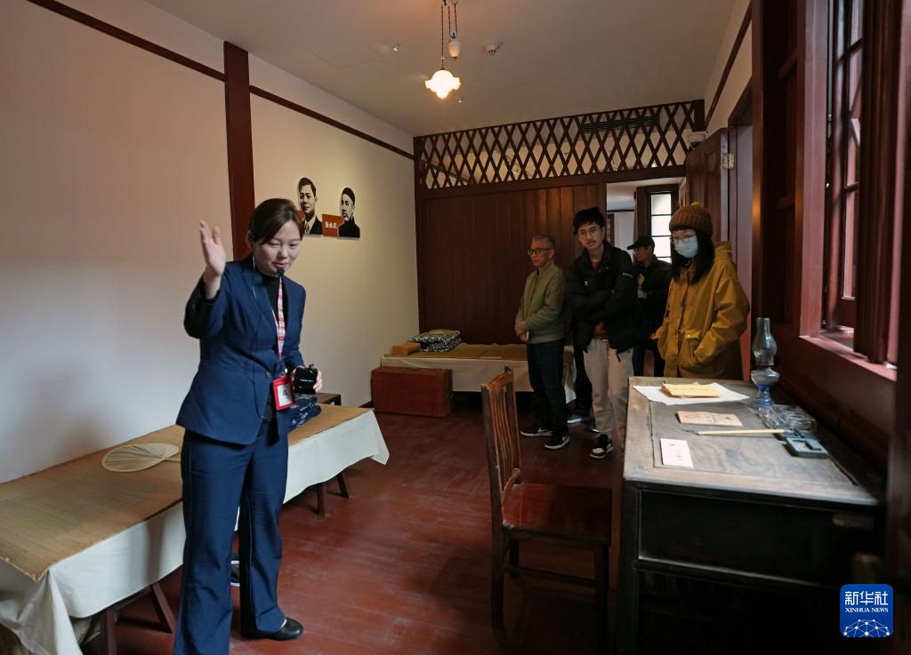 3月24日,讲解员引导观众在中共一大代表宿舍旧址内参观。