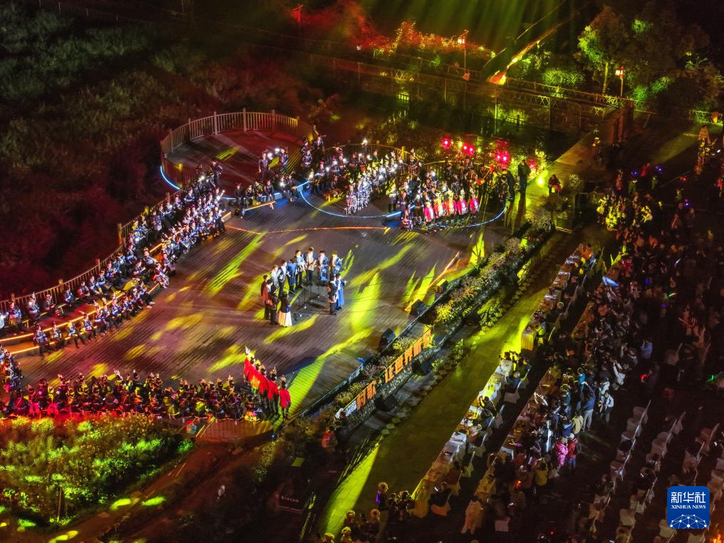 这是3月23日在贵州省黎平县肇兴侗寨拍摄的“大鸾和鸣·天地交响”文化交流专场晚会现场(无人机照片)。