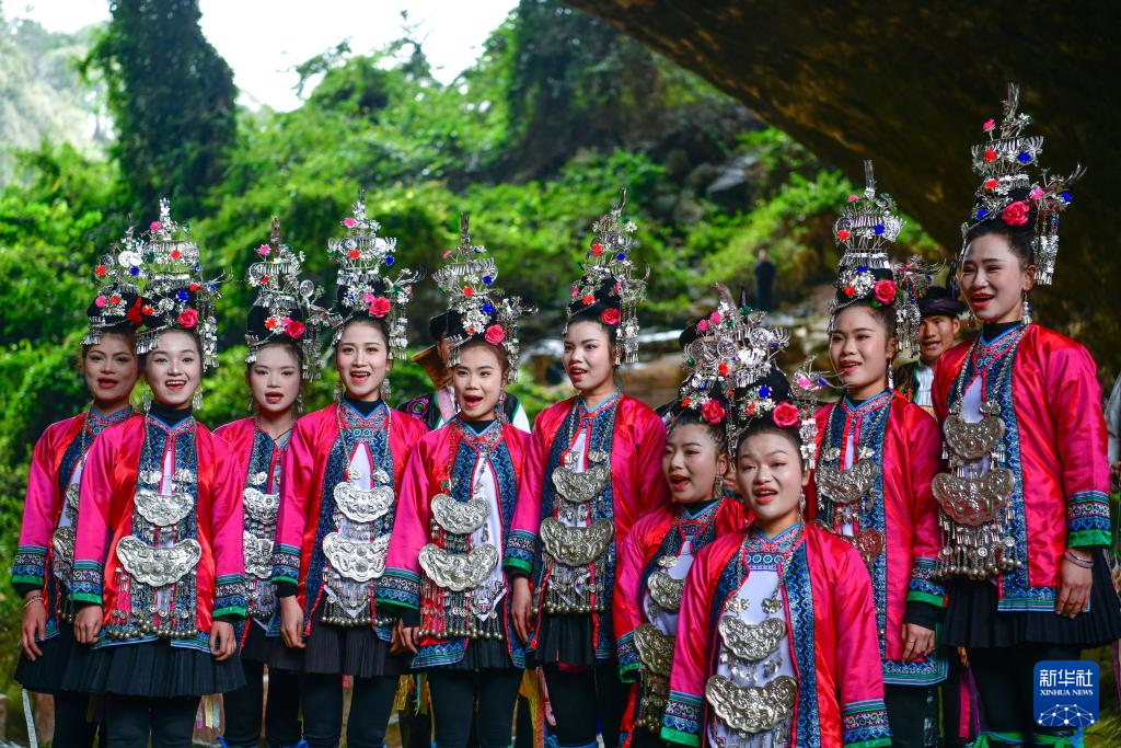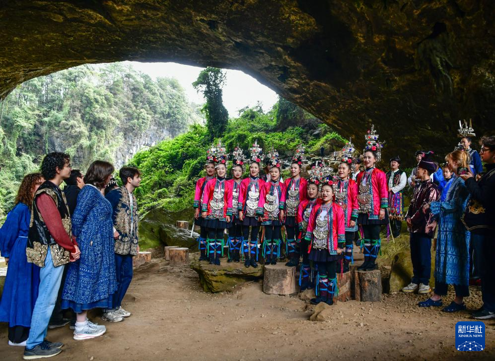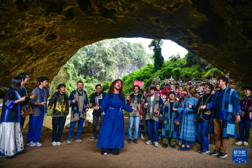 3月24日,在贵州省黎平县天生桥景区,侗族姑娘们为来华交流的美国耶鲁大学威芬普夫斯阿卡贝拉合唱团演唱侗族大歌。