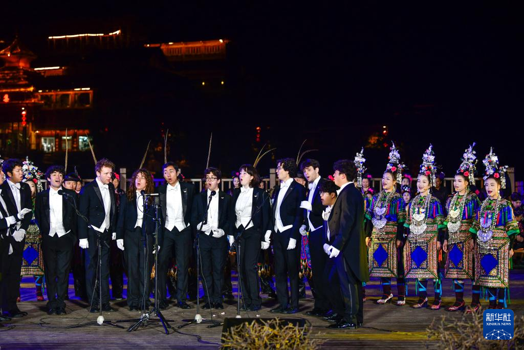 3月23日,在贵州省黎平县肇兴侗寨,美国耶鲁大学威芬普夫斯阿卡贝拉合唱团成员与贵州“村歌”合唱团成员同台演唱歌曲。