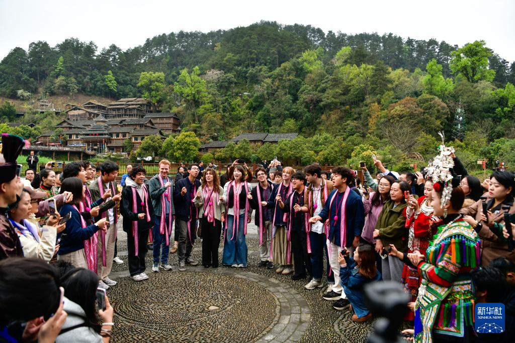 3月24日,在贵州省黎平县天生桥景区,美国耶鲁大学威芬普夫斯阿卡贝拉合唱团在欣赏侗族大歌合唱。