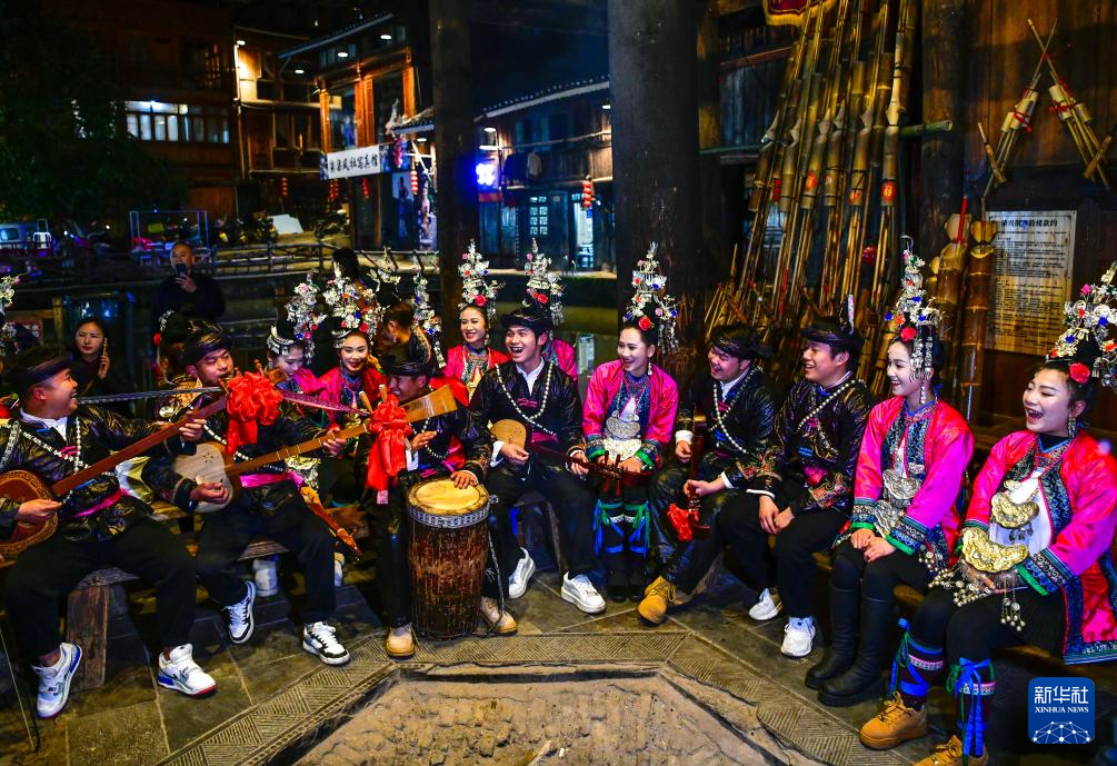 3月23日,侗族青年在贵州省黎平县肇兴侗寨的鼓楼下演唱侗族琵琶歌。