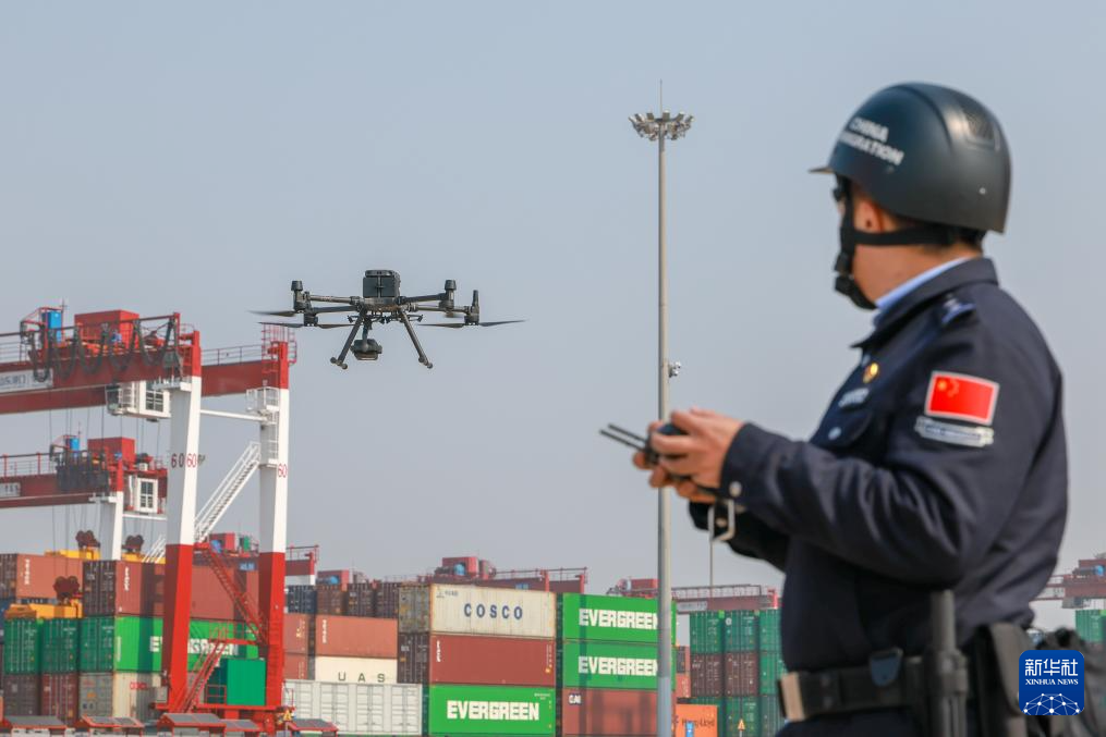 3月25日,执法人员在装卸码头操控无人机巡查。