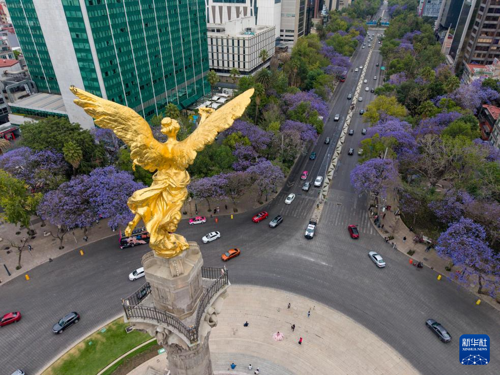 这是3月24日在墨西哥首都墨西哥城改革大道拍摄的蓝花楹(无人机照片)。