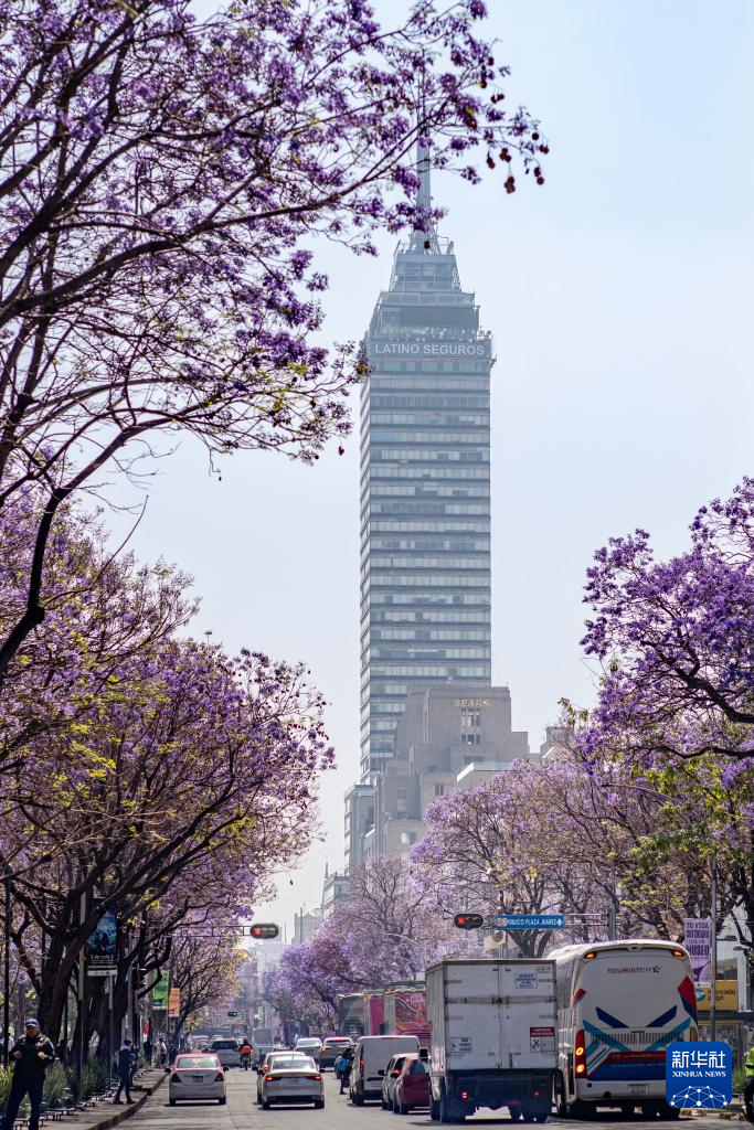 这是3月25日在墨西哥首都墨西哥城拉丁美洲塔附近拍摄的道路两旁的蓝花楹。
