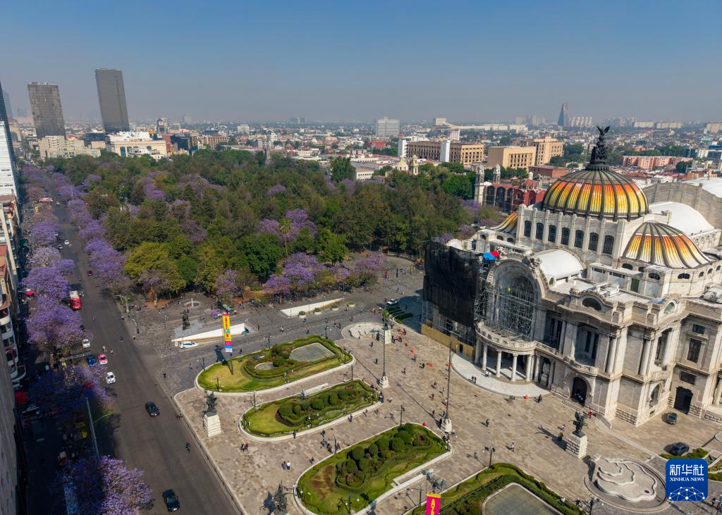 这是3月25日在墨西哥首都墨西哥城国家艺术宫附近拍摄的蓝花楹(无人机照片)。
