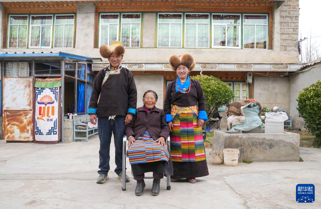 阿旺卓玛(中)和家人合影(3月16日摄)。
