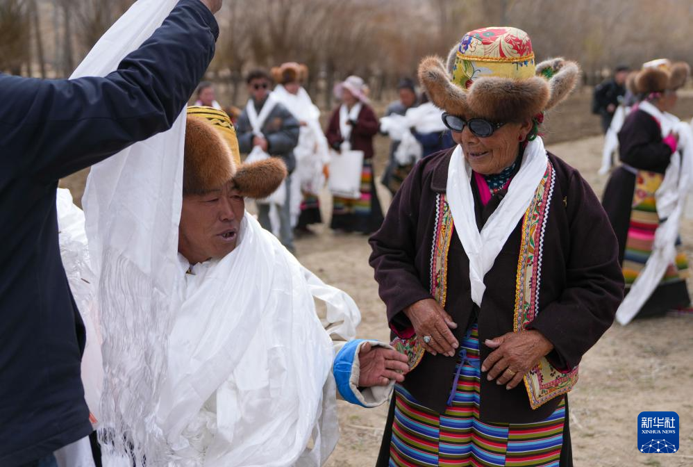 阿旺卓玛(右)在春耕仪式上和乡亲们攀谈(3月16日摄)。