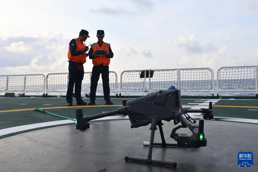3月8日,海警三都舰执法员在甲板上起降无人机。