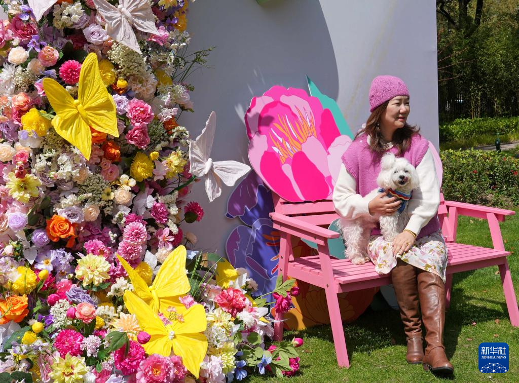 3月28日,在徐汇区的漕溪公园,市民与爱犬在春花置景前留影。