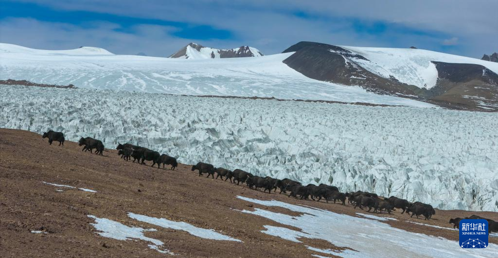 野牦牛群从藏色岗日冰川旁走过(无人机照片,3月10日摄)。