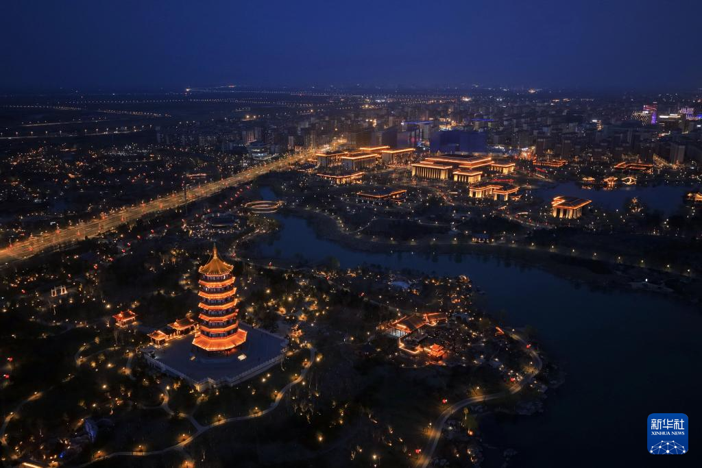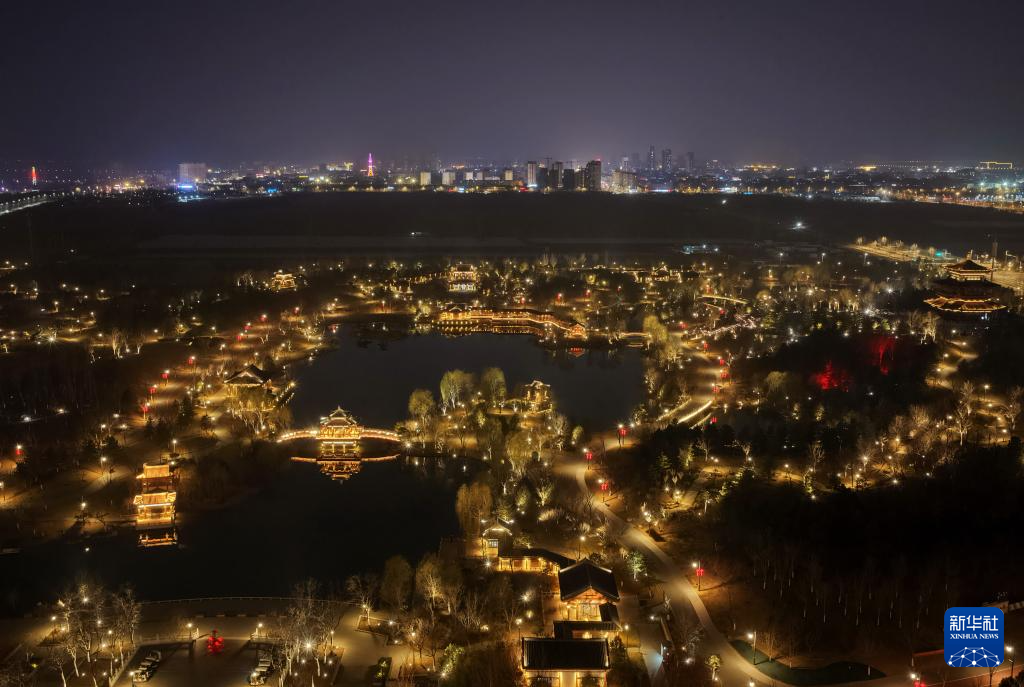 雄安新区悦容公园夜景(3月16日摄,无人机照片)。