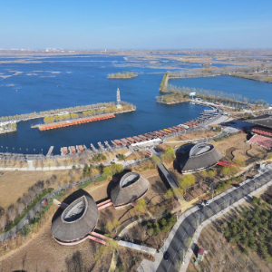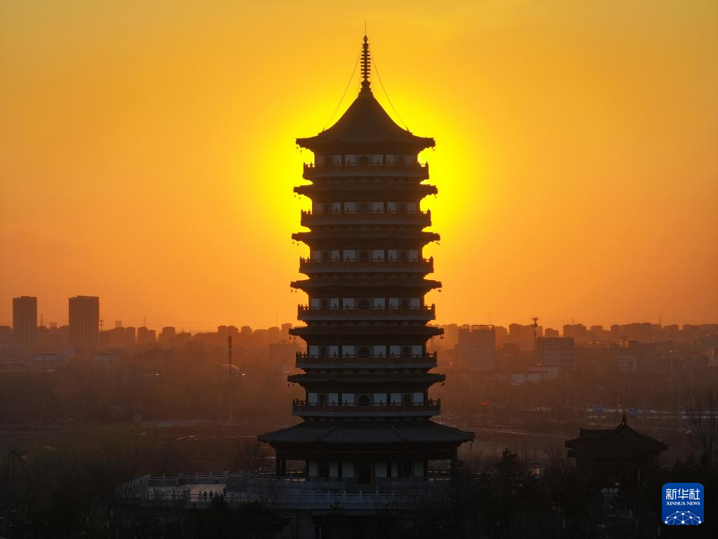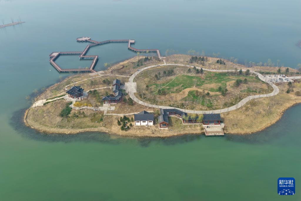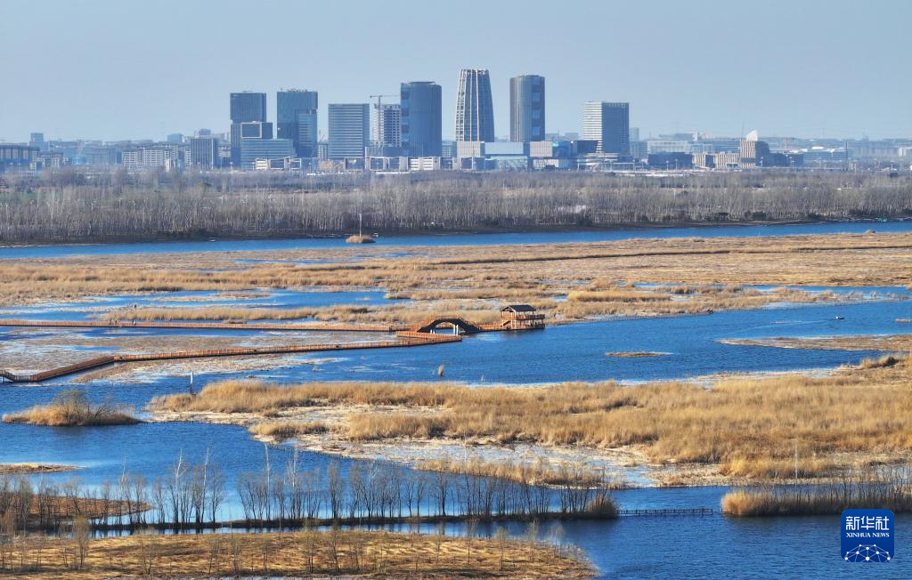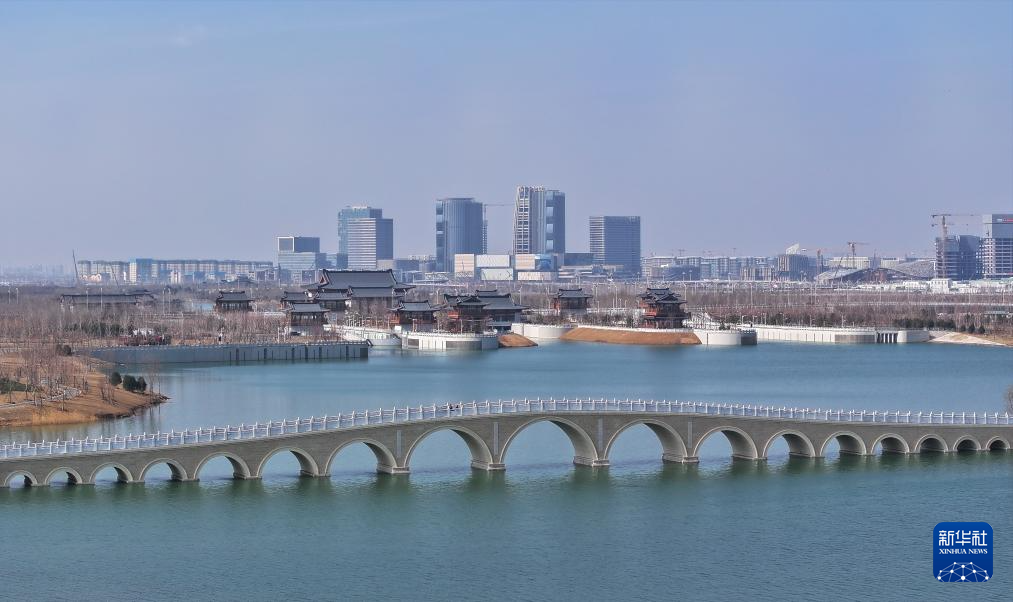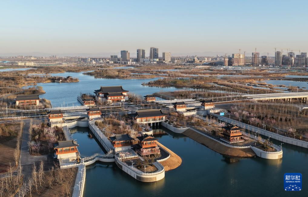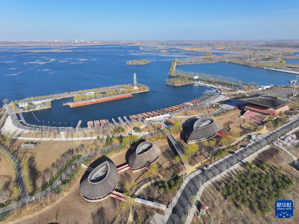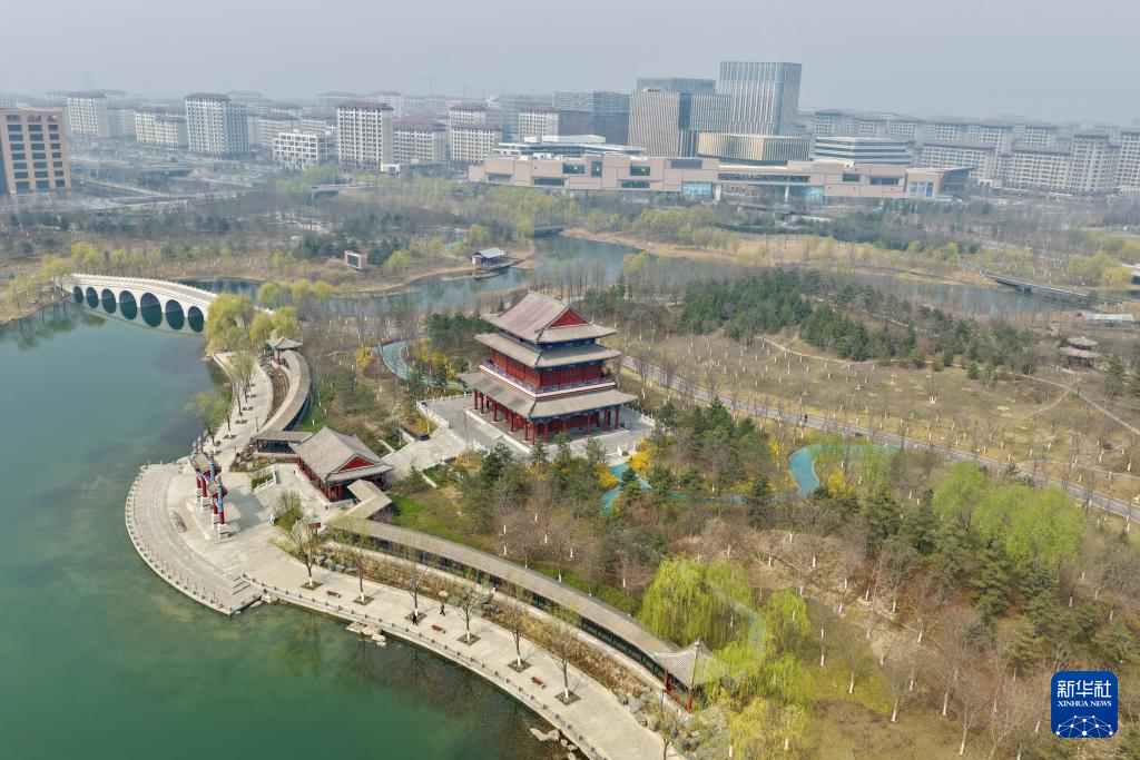 这是雄安新区悦容公园安和塔(3月18日摄,无人机照片)。