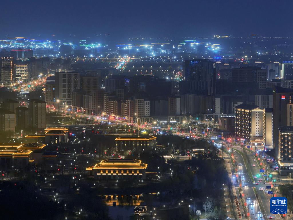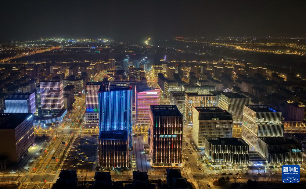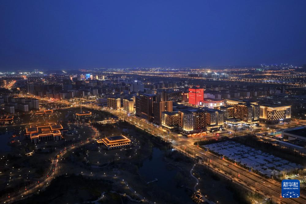 雄安新区商务服务中心片区夜景(3月16日摄,无人机照片)。