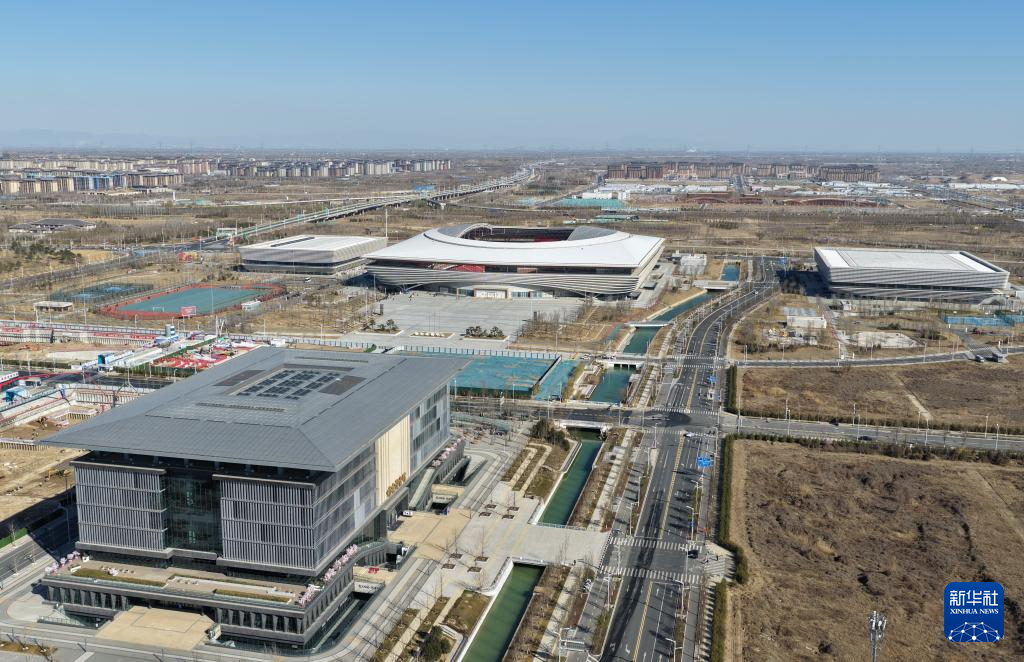 雄安新区图书馆(前)和奥体中心(3月18日摄,无人机照片)。