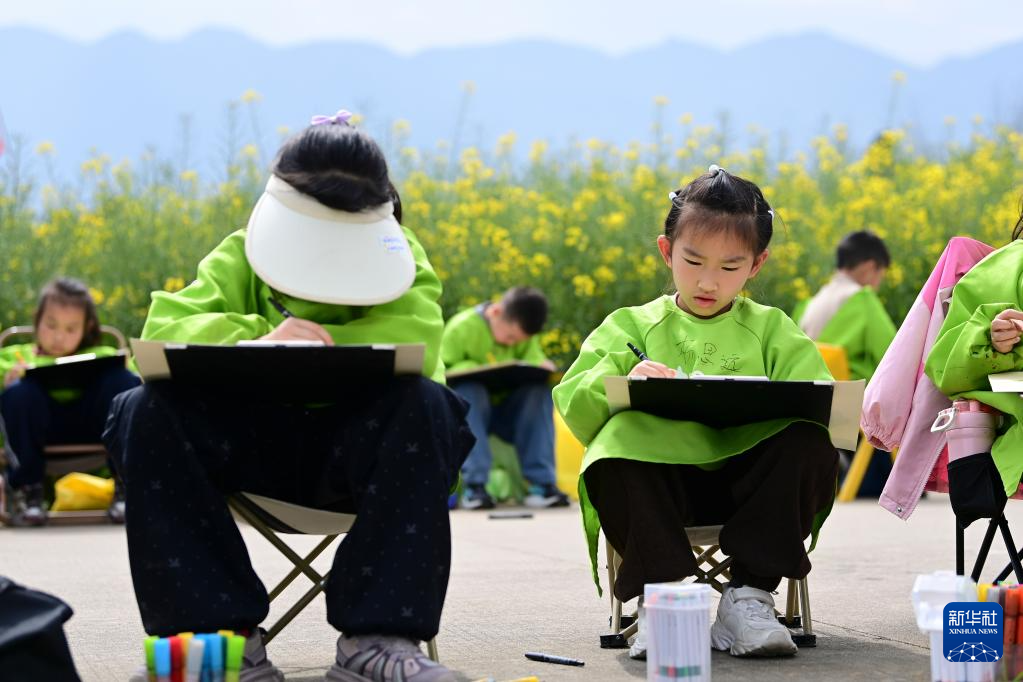 3月28日,学生在汉中市西乡县杨河镇高土坝社区油菜花观花点画画。