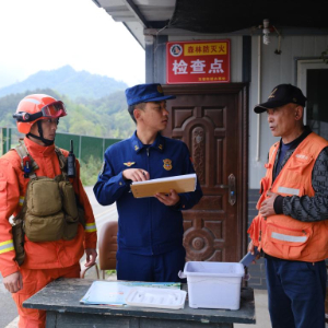 3月29日,消防救援人员(左、中)在都江堰林区入口进行防火检查。