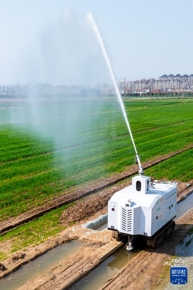 3月27日,智能灌溉机器人在河南省商丘市睢县城关镇袁庄村一处麦田内进行水肥一体化喷灌作业。