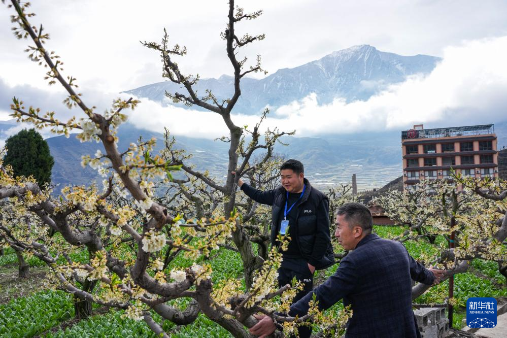 3月31日,在四川茂县“茂县李”标准化种植基地,参会专家和客商在查看李树长势。
