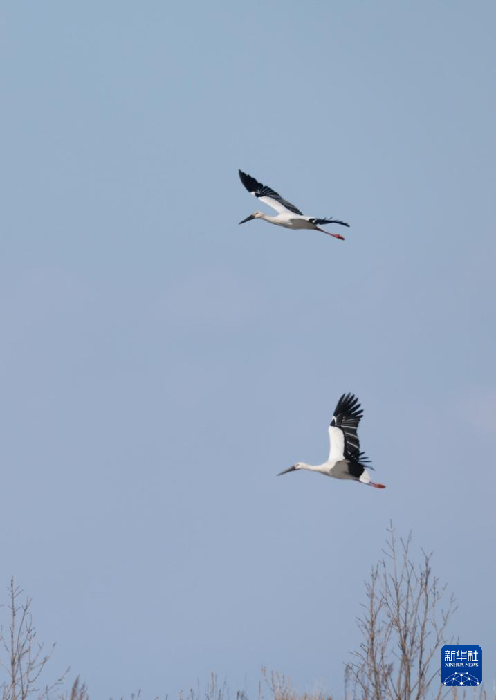3月23日,一群东方白鹳在黑龙江三江国家级自然保护区上空飞翔。