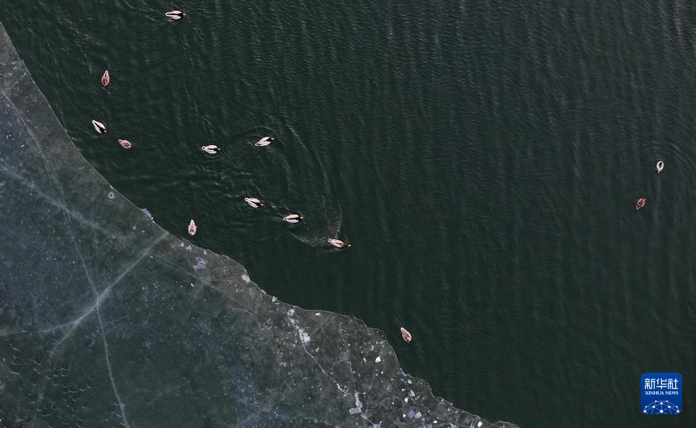 3月30日,一群候鸟在松花江哈尔滨段一处水域游弋(无人机照片)。