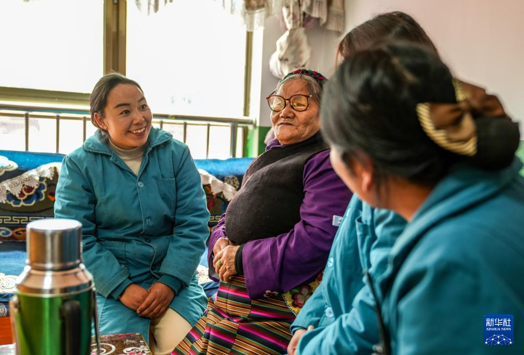 次德吉(左二)在山南市桑日县特困人员集中供养中心宿舍和工作人员拉家常(3月25日摄)。