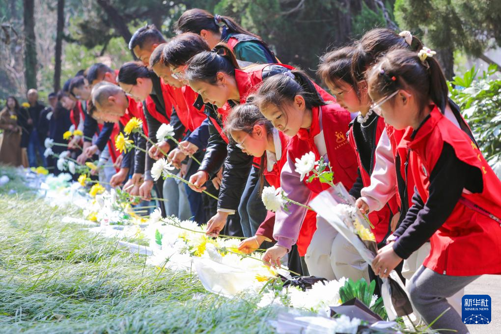 4月2日,人们在河南省商丘市睢县睢杞战役烈士陵园向革命先烈敬献鲜花。