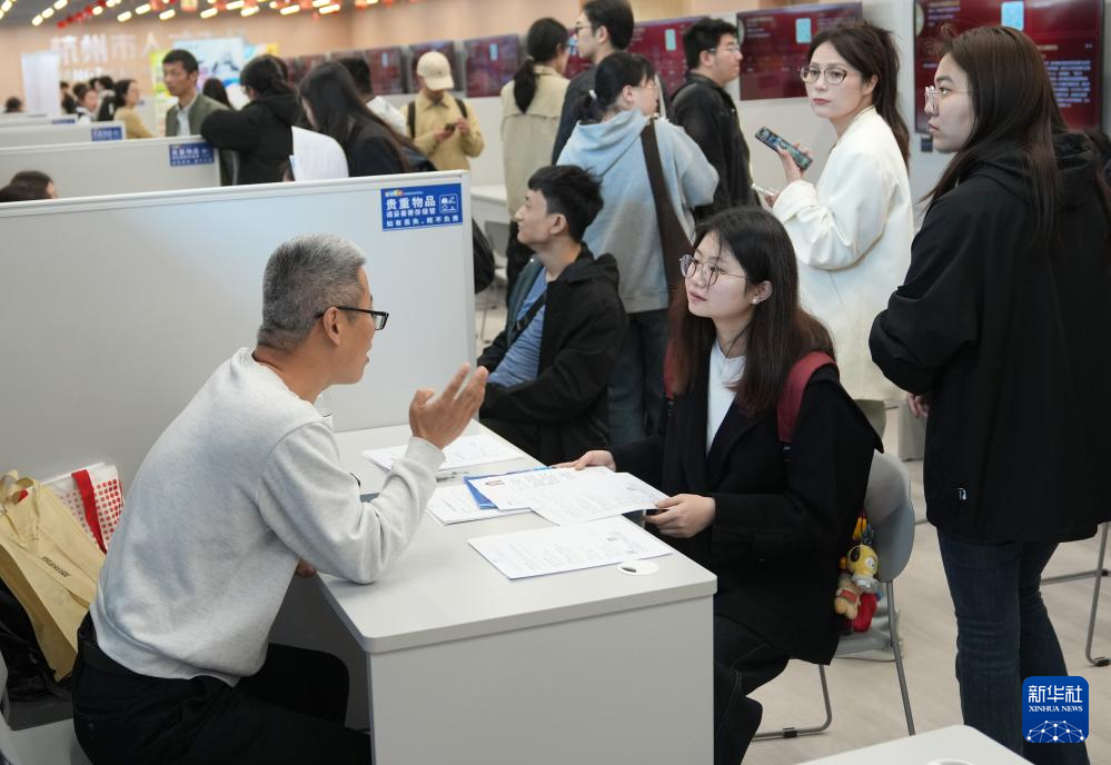 4月2日,求职者与参会企业工作人员在杭州市高校毕业生就业专场招聘会上洽谈。