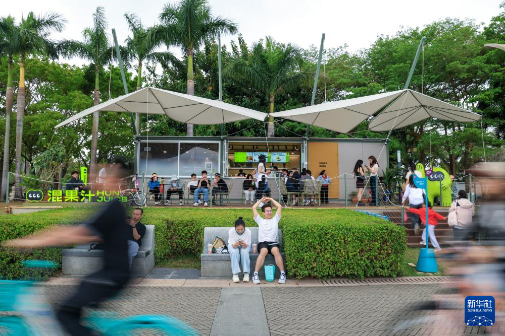 3月29日,游客在深圳湾公园设立的“公园BOX”享受饮品和食物。“公园BOX”是深圳设立的融合自然、艺术与轻商业的公园实验性项目,市民可以在欣赏艺术构筑的同时,体验轻餐饮与文创服务,感受新型公园生活场景的独特氛围。