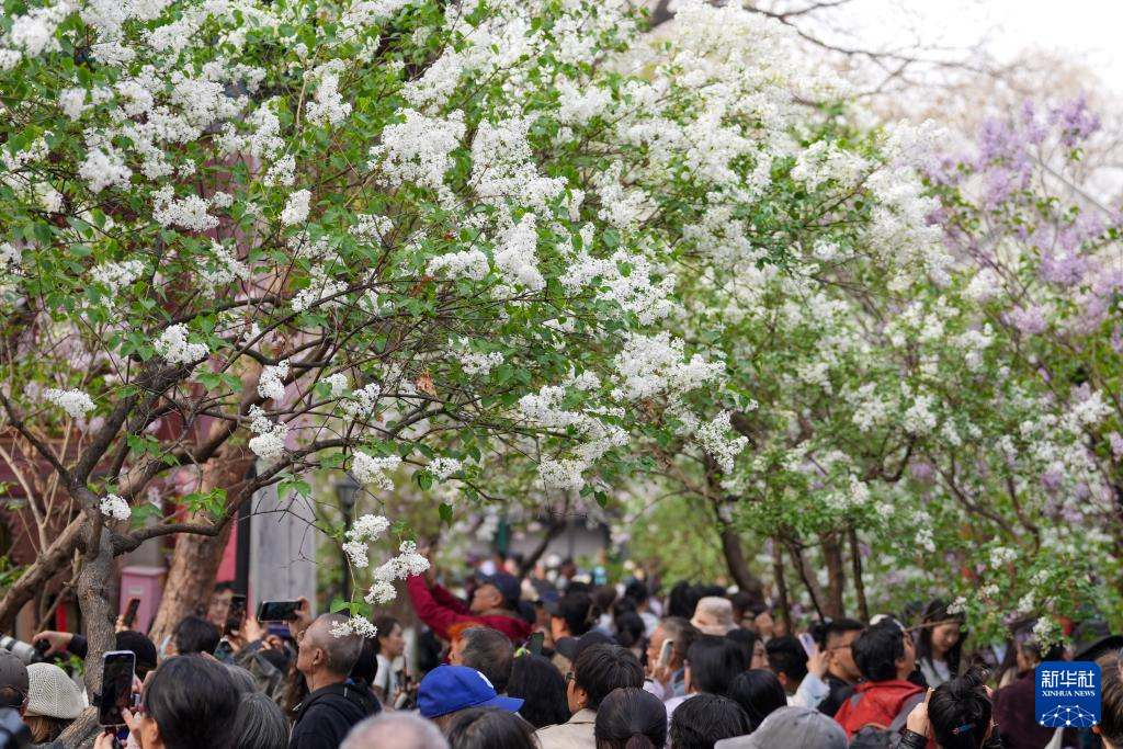 4月2日,游客在北京法源寺内观赏丁香花。