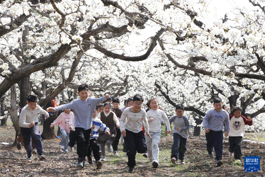 4月2日,在江苏省连云港市灌云县伊园景区,孩子们在梨树花海里游玩。